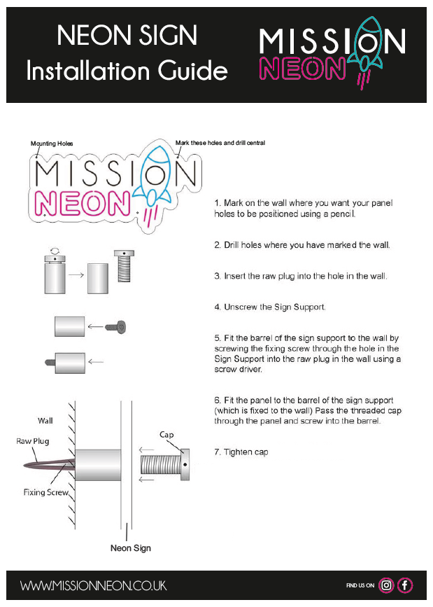 Follow the instructions here to install your custom neon sign. Anybody with basic DIY knowledge can simply and safely install our custom neon lights .
